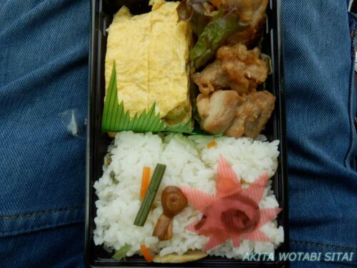 お昼は、あ・ら伊達な道の駅でお弁当を買って見ました。 山菜ごはんと厚焼き玉子お弁当(370円)です。